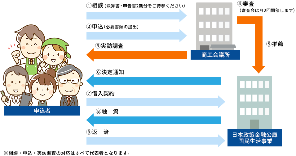 商工会議所の経営指導を受けている小規模事業者の商工業者が、経営改善に必要な資金を「無担保」「無保証」「低金利」でご利用できる制度です。ご利用いただくには商工会議所の推薦が必要となります。