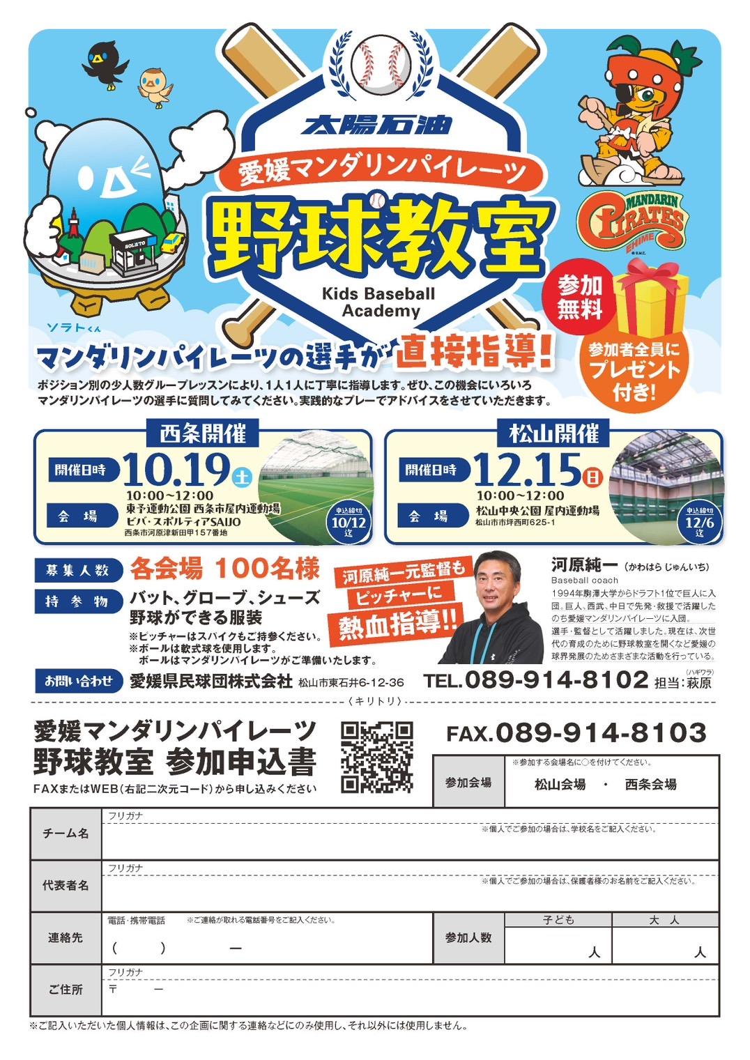 この度、愛媛マンダリンパイレーツは太陽石油(株)様ご協賛による野球教室を下記の要領で開催いたします。