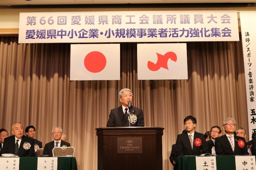 第66回愛媛県商工会議所議員大会、並びに愛媛県中小企業・小規模事業者活力強化集会を去る11月26日に開催し、議員大会において、当面する愛媛県内の諸課題の解決と今後における諸施策の推進に関する要望を、活力強化集会において、愛媛県商工会連合会、愛媛県中小企業団体中央会、愛媛県商店街振興組合連合会とともに、日本経済の成長力強化や中小企業支援に向けた諸施策に向けた要望を議決し、国、県、関係機関等に対し要望書を提出しました。