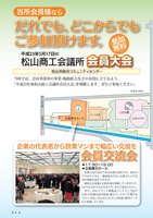 5特 集P至JR松山駅西駐車場出入口西出入口新玉小学校文こども館企画展示ホールイベント広場コスモシアター当所では、会員事業所の事業・販路拡大などのお役に立てるよう、「平成23年度松山商工会議所会員大会」を開催します。ぜひご参加ください。だれでも、どこからでもご参加頂けます。だれでも、どこからでもご参加頂けます。会員大会松山商工会議所参加無料参加無料平成23年5月17日㈫P西駐車場出入口西出入口企画展示ホールコスモシアター企業の代表者から営業マンまで幅広い交流を企業の代表者から営業マンまで幅広い交流を会員交流会会員交流会●17:30~19:00●企画展示ホール松山市総合コミュニティセンター当所会員様なら 会員大会の目玉である会員交流会では、自社のPRはもちろん、普段接点のない企業さんとの交流や情報交換ができます。 簡単なお食事とお飲み物を用意していますので、5分でも10分でも大丈夫です。ぜひご参加ください。 また、松山ブランド新製品コンテスト「NEXT ONE」の受賞作品の試食・展示ブースや、「六菓子なつかしの味」松山おんだがしの試食・販売ブースもご用意しています。むかし昨年度の会員交流会昨年度の会員交流会