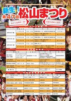 8月10日(金)千舟町会場18:00~20:3016:00~22:0017:00~20:3011:00~22:0017:00~19:0011:00~21:00千舟町通り堀之内公園千舟町通り堀之内公園千舟町通り堀之内公園野 球 拳 お ど り(企業連の部・無審査連の部)野 球 拳 お ど り(団体連の部・無審査連の部)野 球 サンバ野球拳おどり演舞、桟敷席、飲食ブース、子供向けブースの設置など野球拳おどり演舞、桟敷席、飲食ブース、子供向けブースの設置など野球拳おどり・野球サンバ演舞、表彰式、桟敷席、飲食ブース、子供向けブースの設置など堀之内会場千舟町会場堀之内会場千舟町会場堀之内会場8月11日(土)8月12日(日)開 催 日 時内 容場 所8月11日(土)ロープウェー街大街道商店街中央商店街三津浜商店街、三津浜港道後商店街、道後駅前萱町商店街、木屋町商店街味酒小学校、清水公園平井町商店街松山まつり関連イベント野球拳おどり等土曜夜市等土曜夜市等踊り大会、花火大会等野球拳おどり、夜市等野球拳おどり、盆踊り等野球拳おどり、盆踊り等平井町商店街土曜夜市道後村まつり2012松山まつり協賛土曜夜市松山港まつり城北野球拳おどり大会6月23日(土)~8月4日(土)7月21日(土)~8月11日(土)8月5日(日)8月1日(水)・2日(木)6月30日(土)、7月24日(火)7月28日(土)、8月13日(月)八坂小学校八坂野球拳おどり大会8月7日(火)開 催 日 時行 事 名内 容場 所8月1日(水)~8月31日(金)(月~金)20:00~21:00(土・日)19:30~21:001日(水)・2日(木)のみ18:00~21:0020:00~21:20※荒天の場合は8月19日(日)※雨天中止の場合は翌日日没~21:3019:00~20:30道後温泉本館周辺三津埠頭(松山港まつり)松山城全山・本丸(ロープウェイは夜間延長)二之丸史跡庭園道後温泉夏まつり2012太鼓の演奏や音楽ライブなど多彩なイベントを開催(道後商店街、道後温泉本館前を会場に野球サンバ・野球拳おどりを実施)二之丸サマーフェスティバル2012松山港まつり松山城 光の城水中花火や仕掛花火など各種花火の祭典二之丸サマーフェスティバル 2012 夏の星座と輝く夜空、そしてイルミネーションがおりなす“光のファンタジー”8月5日(日)8月4日(土)・5日(日)8月13日(月)‐おどり会場他フォトコンテスト松山まつりを題材としたフォトコンテスト期 間 中開 催 日 時内 容行 事 名場 所 松山まつり 松山まつりメ イ ン 事 業特 別 協 賛 事 業地 域 関 連 協 賛 事 業新生!新生!第47回第47回おどり会場を一新!日程を週末に変更!特集特集4