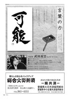 言葉の力ことばちから書道家・武田双雲氏の筆による「言葉」。その筆と言葉に込められた想いを、どうか感じ取ってみてください。書道家武田双雲(たけだ そううん)●1975年熊本生まれ●NHK大河ドラマ「天地人」の題字などを揮毫●日本テレビ「世界一受けたい授業」など多数のメディアに出演●著書に「上機嫌のすすめ」などがある【公式サイト】http://www.souun.net【公式ブログ】http://ameblo.jp/souun/「できない」という人は「できない理由」をかき集め「できる」という人は「できる理由」をかき集める。どちらの理由を集めていくかは、自分しだいだ。コラムコラム15