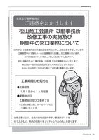 松山商工会議所 3階事務所改修工事の実施及び期間中の窓口業務について会員及び関係者各位ご迷惑をおかけします当所では、3階事務所部分の電気設備老朽化に伴い、改修工事を予定しています。工事期間中は5階大ホールに仮事務所を設置し、窓口業務を行います。ご不便をおかけしますが、よろしくお願い申しあげます。また、移転のため工事の前後2日程度、平日の業務を休止いたします。休止日は一切の窓口対応ができませんのでご了承ください。※休止日以外の工事日は5階にて通常通り業務を行います。●工事期間 11月1日から1ヵ月程度●業務休止日 工事開始日及び工事終了日 ※正式に決定次第、ホームページにて ご通知いたします。改修工事により、会員の皆様が訪れやすい事務所づくりを行うとともに、所内の情報セキュリティレベルの向上を図ります。工事期間のお知らせ施策情報掲示板施策情報掲示板10
