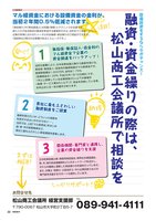 注目!納得安心!しっかりサポート!まずは相談!無担保・無保証人・低金利のマル経資金で企業の資金調達をバックアップ!当所の推薦により、日本政策金融公庫から融資を受ける、無担保・無保証人・低金利の融資制度がマル経資金です。融資限度額は1,500万円、金利は1.75%(設備資金は1.25% 平成25年1月15日現在)です。1年以上営業している従業員数20人以下の事業所(商業・サービス業は5人以下)で、税金を完納している等、お申込みには一定の要件があります。1貴社に最もふさわしい融資制度をご提案融資を受けたいが、どういった制度を利用すればよいかわからない・・・。当所では、上記「マル経資金」をはじめ国・県・市の制度融資など、貴社に最もふさわしい資金調達を提案します。2関係機関・専門家と連携し、企業の資金繰りを支援日本政策金融公庫、県信用保証協会、県再生支援協議会、県、市、県内各金融機関などとのネットワークを活かし、それらの機関と連携した資金繰りの支援を行っています。また、弁護士・税理士・公認会計士・中小企業診断士などの専門家を派遣するサポートも提供しています。3089-941-4111TEL〒790-0067 松山市大手町2丁目5-7松山商工会議所 経営支援部融資・資金繰りの際は、 松山商工会議所で相談を設備投資をするなら今がチャンス!マル経資金における設備資金の金利が、当初2年間0.5%低減されます。「資金繰り」や「資金調達」には知識(情報)とテクニックが必要です。借り入れや返済負担の軽減を希望する事業所の方は、当所までご連絡ください。企業の実情に合わせたトータル的な融資・資金繰りのご相談ができます。(相談時は2期分の決算書があるとスムーズです。)お問合せ先制度案内制度案内23
