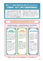 「企業防災・BCPに関する調査研究報告書」南海トラフ地震の被害を最小限に抑えるためには… 当所では、近い将来に発生が予想される南海トラフ地震の被害を最小限に抑えるため、企業防災を呼びかけてきました。まず、「まず何より顧客・従業員の人命・安全を守る。また企業として地域に危険を及ぼすような二次災害を出さない。」次に、「災害時、企業の最大の社会的責任は事業を中断させないこと。そのためのBCP(事業継続計画)を策定する。」そして、「地域コミュニティの一員として地域の防災対策に貢献する」というものです。BCP策定の有無により、災害発生時の事業継続・事業再開に大きな差が出ることが実証されています。当所では企業防災とBCPについて松山市内3地区の事例をとりまとめましたので報告します。地域防災組織と企業の連携に関する事例地域防災組織と企業の連携に関する事例〇垣生地区自主防災会連合会 〇五明地区自主防災会連合会 〇南江戸本村防災会の3地区を選定し、自主防災組織及び一部企業・事業所のヒアリング調査を行いました。垣生地区自主防災会連合会 重信川河口右岸に位置し、地区人口約11,000人、世帯数は約4,200。重信川の氾濫による浸水や瀬戸内海の高潮、南海地震による津波や液状化の被害が想定される。【企業との連携】 平成23年から「災害対応時における協力申出書」という形で、企業・団体から災害時の支援を取り付け、24年8月現在で約100件の協力を得ている。協力項目の中に「津波避難ビル」の項目を設けた。五明地区自主防災会連合会南江戸本村防災会 松山市中心街から車で20分の中山間地域。標高約300m。世帯数205、地区人口600人。河川氾濫・がけ崩れ等が想定される。【企業との連携】 地域の企業が、大規模災害発生時にその所有する施設の一部を地域住民の緊急避難施設及び応急救護所として提供することを明文化。共同の避難訓練も行っている。 松山市中心部のJR松山駅の西側に位置し、世帯数約1300、地区人口約2600人。住宅密集地があり、地震による家屋倒壊や火災の被害が想定される。【企業との連携】 地区内に設立されたグループホームと意見交換等を行っている。また消防局の許可を得て、グループホームにサイレンを取り付け、緊急時にはサイレンを鳴らし、近隣協力員が駆けつける体制を整えている。→※本調査のとりまとめは、(公財)えひめ地域政策研究センターと共同で実施しました。特集4