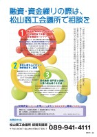 無担保・無保証人・低金利のマル経資金で企業の資金調達をバックアップ!無担保・無保証人・低金利のマル経資金で企業の資金調達をバックアップ!当所の推薦により、日本政策金融公庫から融資を受ける、無担保・無保証人・低金利の融資制度がマル経資金です。融資限度額は2,000万円、年金利は (平成26年8月13日現在)です。市内で1年以上営業している従業員数20人以下の事業所(商業・サービス業は5人以下、宿泊業及び娯楽業は除く)で、税金を完納している等、お申込みには一定の要件があります。1貴社に最もふさわしい融資制度をご提案 はさらに に!! %(当初2年間) されます! はさらに に!! %(当初2年間) されます!設備資金 お得 0.5 軽減設備資金 お得 0.5 軽減融資を受けたいが、どういった制度を利用すればよいかわからない・・・。当所では、上記「マル経資金」をはじめ国・県・市の制度融資など、貴社に最もふさわしい資金調達をご提案します。2関係機関・専門家と連携し、企業の資金繰りを支援関係機関・専門家と連携し、企業の資金繰りを支援日本政策金融公庫、県信用保証協会、県再生支援協議会、県、市、県内各金融機関などとのネットワークを活かし、それらの機関と連携した資金繰りの支援を行っています。また、弁護士・税理士・公認会計士・中小企業診断士などの専門家のサポートも提供しています。3089-941-4111TEL〒790-0067 松山市大手町2丁目5-7松山商工会議所 経営支援部「資金繰り」や「資金調達」には知識(情報)とテクニックが必要です。借り入れや返済負担の軽減を希望する事業所の方は、当所までご連絡ください。企業の実情に合わせたトータル的な融資・資金繰りのご相談ができます。〔相談時は2期分の決算書(付随資料)、申告書をご持参ください。〕1.45%1.45%※詳しくはお問い合わせ下さい。●老朽化した設備を買換えて、新設備を購入される方。●一定規模以上の設備投資をされる方。●設備投資計画を踏まえた事業計画を作成される方。制度案内24