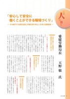 ――プロフィールを教えてください。 出身は愛知県です。大学を卒業後、民間企業に3年間いましたが、在職中、仕事でケガをしたことがキッカケで労働災害防止に関心を持ち、労働基準監督官という仕事があることを知り、採用試験を受けて監督官となる道を選びました。若い頃は監督署に勤務し、工場や建設現場を回って労働条件や災害防止などの指導を行いましたが、本省では通算で14年ほど労災補償を担当しました。特に、職業病の認定に長く携わり、昭和60年代以降に問題化した過労死については、平成13年、労災認定の基準の改正にも関わりました。最近では、マスコミでも大きく取り上げられた胆管がんの労災認定にも尽力しました。原因となった物質自体の有害性について認識が乏しかったため、結論に導く作業は難航しましたが、専門家を集めた検討会で議論を重ねるなど、当時の上司・部下と一丸となって取り組み、報告書を取りまとめることができました。「 安心して安全に 働くことができる職場づくり 」愛媛労働局長 天野 敬 氏 ~ きめ細やかな就労支援と労働災害の防止と女性の活躍推進 ~民間企業から監督官へ…職業病の認定に携わる人このに聞く――愛媛の雇用情勢については…。 7月の全国の有効求人倍率は1・10倍となり、前月と同水準となりました。平成4年6月以来の水準となっています。一方、愛媛県は、全国よりも高い1・13倍となっており、こちらも平成4年以来、22年ぶりの水準となっています。全国的な傾向ですが、愛媛県内においても、建設、介護や看護など社会保障分野は、人手不足感が顕著となっ22年ぶりの高水準となるも非正規雇用が下支え――そういった中で愛媛労働局の取り組みは…。 愛媛労働局では、若年者から高齢者までの就労支援をはじめとする雇用対策のほか、労働災害の防止や、女性の活躍推進を労働災害の防止と女性の活躍推進ています。求職者ニーズに応じた求人の確保を図ることは必要ですが、人材不足分野においては、魅力ある職場づくり、働き甲斐のある職場づくりなど、雇用管理の改善に向けた取り組みが重要になっています。また、正社員の有効求人倍率は0・66倍と1倍に満たない状況となっており、小売業をはじめとした、パートやアルバイトなど非正規雇用が求人の多くを占めています。本格的な雇用の回復につなげるためには、正規雇用の拡充が求められるところです。2この人に聞く