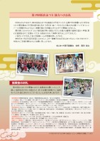 8月8日から10日まで、第49回松山まつりを実施する予定でしたが、台風11号の影響により、8月9日(土)の野球拳おどり「団体連の部」及び、8月8日(金)~10日(日)の堀之内公園イベント「まつこいパーク」事業を中止するなど、規模の縮小を余儀なくされた中での開催となりました。 悪天候にもかかわらず、おどり参加者の熱い演技と10万人を超える観客の皆様の温かい声援、更には協賛各社のご支援をいただき、お陰をもちまして無事に終えることができました。 ご協力いただきました多くの皆様に、心より感謝を申し上げます。 来年のまつりは50回の節目にふさわしい、より一層魅力のある「松山まつり」にしてまいりますので、今後ともご支援を賜りますようお願い申し上げます。松山まつり実行委員会 会長 森田 浩治 第49回松山まつりの開催にあたり、協賛金をお願いしたところ、厳しい経済状況の中にも関わらず、多くの企業の皆様からご協賛をいただき、誠にありがとうございました。心よりお礼申しあげます。【卸売業部会】愛媛県漁業(協) 連合会/愛媛県森林組合連合会/(有)石丸弥蔵商店/くつな商店/(株)コーアガス愛媛/(株)三愛テキスタイル/(株)三和新建材/(株)西日本常盤商行/(株)福屋【小売業部会】(有)荒井鮮魚店/(株)ウエスト/(有)愛媛新聞桑原専売所/(株)愛媛プレスウイン/(株)オフィストウキ/(有)GFK/シナリー化粧品ジュネス本町営業所/(有)ティーカンパニー/ニシガワ酒店/(有)ミニヨン/(有)毎日新聞中部販売所/(株)ママイ フレッシュバリュ- 松山店/モードサロンシゲル/(株)山内石油/(株)ヤマトヤ/(株)四国ノバックス 本社/竹田花店【建設業部会】井出タイル/愛媛電工(株)/(株)エム・ワイ・ティ/(有)クボタ/(株)ケイ・アール総合企画/三洋興産(株)/瀬戸内建設(株)/(株)拓殖/(株)中予ステンレス工業/(有)ティケイ建設工業/東洋水道(株)/(有)西森板金/日滝工業(株)/(有)ふげんトータルサービス/松山市管工事業(協)/(有)山博建設【製造業部会】(株)イフイ/イワサキ工業/(株)四国総合印刷/(株)シンワ機工/第一港運(株) 松山支店/(株)中予精工/東レ(株)水処理システム事業部/(株)林鐵工所/(有)横井工作所/楽々社【金融業部会】日本カーソリューションズ(株) 松山支店/松和商事(株)/三井生命保険(株) 愛媛支社【観光・飲食業部会】(有)ことり/(有)食楽工房/手打蕎麦 まろ/やきとり TORiZO【情報・サービス業部会】テン開発(株)/(株)松山中央ボウル/(株)愛キャリアながさき/(株)EBCプロダクション/(株)エーシーイーシステム/愛媛県経営者協会/(株)MRC乗馬クラブ/(株)エム・エス・エンタープライズ゙/(医)岡本外科胃腸科医院/おそうじ本舗 松山城西店/かやまち商店街振興会/(株)環研エンジニアリング/(株)ケンホームズ/(株)彩都マネジメント/四国消毒(株)/城西地区商店街/信和警備保障(株)/(株)スジャータ/(株)大建設計工務/(株)ダスキン椿/西山自動車整備工場/ハイサブ/(株)ビジネスアシスト四国/ふさこの店/(株)マツダモビリティ 西四国/(株)松山アドバンス/(医)松山平成会/(株)円クリエーション/三好典史司法書士事務所/(有)森産業/理容さいき/愛媛県遊技業(協)※平成26年7月11日以降に承諾をいただいた事業所を掲載しています。協賛金のお礼第49回松山まつり 協力へのお礼特集5