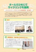 12~サイクリング・パラダイスえひめ推進会議 設立総会~ 9月29日、サイクリング・パラダイスえひめ推進会議の設立総会を東京第一ホテルにて開催しました。同推進会議には、各団体からの呼びかけにより約400事業所が参画しています。設立総会には、参画事業所から約130名、また、同推進会議顧問の中村知事をはじめ、愛媛県からは上甲副知事、門田企画振興部長、神野経済労働部長、三好農林水産部長、また、県内の市町長16名の出席のもと盛大に開催しました。 まず、サイクリング・パラダイスえひめ推進会議の会長に就任した当会議所の森田会頭より「地域創生は地域の特性を活かした活性化が求められている。サイクリングこそ、これからの愛媛活性化の起爆剤になると確信している。経済界もビジネスチャンスと捉えて、サイクリング振興に取り組みたい。」との挨拶がありました。また、顧問の中村知事からは「自転車新文化を広めているが、その可能性はどんどん膨らんでいる。その中で、推進会議の結成は大きな弾みとなる。まず、自分たちが楽しむことから初めて、より自転車の輪を広げてほしい。」と述べられました。続いて、同推進会議の経緯や今後の活動方針について報告しました。 引き続き、「自転車が地域を変える」をテーマに、自転車ツーキニストの疋田智氏から、講話がありました。疋田氏は、自転車通勤を提唱し、自転車ツーキニストとして全国を行脚、47都道府県の自転車事情に精通しています。疋田氏からは、しまなみ海道は日本一のサイクリングコースであり、地域でその魅力を再確認して情報発信するなど、さらなる活用を促されたほか、自転車の安全運用について、宇都宮市や福岡市などの事例を説明されました。また、ヨーロッパなどの自転車まちづくりについても紹介されるなど、今後の自転車施策に関するアドバイスをいただき、参加者は熱心に聞き入っていました。オールえひめにてサイクリングを振興総会基調講演「自転車が地域を変える」▲挨拶する中村愛媛県知事▲森田会頭の開会あいさつ▲講演する疋田氏特集4