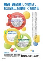 089-941-4111TEL〒790-0067 松山市大手町2丁目5-7松山商工会議所 経営支援部無担保・無保証人・低金利のマル経資金で企業の資金調達をバックアップ!無担保・無保証人・低金利のマル経資金で企業の資金調達をバックアップ!当所の推薦により、日本政策金融公庫から融資を受ける、無担保・無保証人・低金利の融資制度がマル経資金です。融資限度額は2,000万円、年金利は (平成26年12月10日現在)です。市内で1年以上営業している従業員数20人以下の事業所(商業・サービス業は5人以下、宿泊業及び娯楽業は除く)で、税金を完納している等、お申込みには一定の要件があります。1貴社に最もふさわしい融資制度をご提案融資を受けたいが、どういった制度を利用すればよいかわからない・・・。当所では、上記「マル経資金」をはじめ国・県・市の制度融資など、貴社に最もふさわしい資金調達をご提案します。2関係機関・専門家と連携し、企業の資金繰りを支援関係機関・専門家と連携し、企業の資金繰りを支援日本政策金融公庫、県信用保証協会、県再生支援協議会、県、市、県内各金融機関などとのネットワークを活かし、それらの機関と連携した資金繰りの支援を行っています。また、弁護士・税理士・公認会計士・中小企業診断士などの専門家のサポートも提供しています。3「資金繰り」や「資金調達」には知識(情報)とテクニックが必要です。借り入れや返済負担の軽減を希望する事業所の方は、当所までご連絡ください。企業の実情に合わせたトータル的な融資・資金繰りのご相談ができます。〔相談時は2期分の決算書(付随資料)、申告書をご持参ください。〕1.35%1.35%制度案内27
