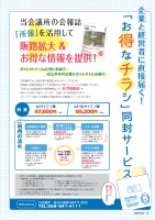 「お得なチラシ」同封サービス当所の会報誌 「所報」を活用して販路拡大&お得な情報を提供!◆◆◆◆◆◆◆◆◆◆◆◆◆◆◆◆◆◆◆◆◆◆◆◆◆◆◆◆◆◆◆◆◆◆◆◆◆◆◆◆◆◆◆◆ ◆◆◆◆◆◆◆◆得チラ得チラ♥◆◆◆◆◆◆◆◆◆◆◆◆◆◆◆◆◆◆◆◆◆ ◆◆◆◆◆◆◆◆◆◆◆◆◆当会議所の会報誌 を活用して当会議所では、会員企業の販路拡大をサポートするため会報誌に会員企業等のチラシを同封する「得チラ」サービスを実施しています。「所報」は、会員事業所や関係機関などに を毎月(12月除く)発行しています。企業とその経営者の元までダイレクトに届くため貴社の情報を伝える最適なツールとなります。「所報」販路拡大&お得な情報を提供!約7000部約7000部松山市内の企業にダイレクトにお届け同封サービス 企業と経営者に直接届く!企業と経営者に直接届く!「お得なチラシ」A4サイズ 1種 A3・B4サイズ 1種95,200円ダイレクトメールより安い料金で47,600円○本サービスの利用は、当会議所の会員企業及び行政または公的団体のみとします。○利用に際しては下記事項を遵守してください。○当会議所が定める広告掲載基準にそぐわない場合はサービスの利用をお断りすることがあります。1)公序良俗に反しないこと。2)関係法規に違反しないこと。3)政治性、宗教性がないこと。4)虚偽、または誤認される恐れがないこと。5)他の会員、消費者へ不当な不利益を与える恐れがないこと。6)その他、当該サービス運用上不利益と認められないこと。※チラシの枚数は7000枚固定となっております。※A3・B4サイズはA4サイズに折っていただいた上で、当会議所への納品をお願いいたします。チラシを準備発刊日(毎月10日)チラシを同封「所報」を発刊お支払い請求書・該当月の「所報」を貴社まで発送。同月最終日までに、お支払いをお願いいたします。※土・日曜、祝日の場合は 前営業日までご利用の流れ当会議所必着:発刊日前月15日まで※土・日曜、祝日の場合は 前営業日まで申込書とチラシサンプルを提出まずはご連絡ください。申込書・運用規定の資料をお送りいたします。当会議所にて確認後、チラシ納品までのスケジュールをご連絡いたします。スケジュールに基づき、チラシをご準備ください。当会議所までチラシを発送してください。届いたチラシを確認後ご連絡いたします。当会議所にご連絡チラシを発送当会議所必着:発刊日前月25日まで※土・日曜、祝日の場合は 前営業日まで(税抜)(税抜)当会議所 総合企画部「得チラ」担当TEL:089-941-4111 お問い合わせ料 金得チラと呼んでください!会議所の動き8