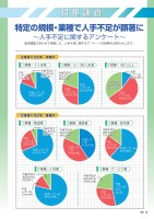 特定の規模・業種で人手不足が顕著に~人手不足に関するアンケート~付帯調査付帯調査景況調査にあわせて実施した、人手不足に関するアンケートの結果をお知らせします。○従業員の充足感(規模別)○従業員の充足感(業種別)①規模-5人未満①業種-製造業②業種-建設業 ③業種-卸売業④業種-小売業⑤業種-サービス業③規模-100人以上②規模-5~100人未満充足している81%(51件)充足している50%(20件)不足している55%(11件)不足している30%(12件)不足している25%(4件)不足している23%(3件)不足している30%(13件)不足している12%(4件)今後不足が見込まれる9%(3件)今後不足が見込まれる23%(10件)今後不足が見込まれる15%(2件)今後不足が見込まれる35%(7件)今後不足が見込まれる20%(8件)今後不足が見込まれる6%(4件)不足している13%(8件)充足している10%(2件)今後不足が見込まれる18%(3件)今後不足が見込まれる6%(1件)充足している69%(11件)充足している41%(7件)不足している41%(7件)充足している62%(8件)充足している47%(20件)充足している79%(27件)8特集