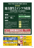 全イベント参加無料当会議所の会員企業に所属する方なら、どなたでも参加できるイベントです。ぜひ、ご参加ください。(複数人での参加もできます。)自社のパンフレットも設置できます。当会議所会員企業に所属されている方ならどなたでも、複数でご参加いただけます。京都大学工学部卒業後、スウェーデン・ イエテボリ大学客員研究員、京都大学大学院助教授、東京工業大学教授等を歴任し平成21年から現職。平成23年から京都大学レジリエンス研究ユニット長を務める。平成24年12月から内閣官房参与 (防災・減災ニューディール政策担当)。著書は「救国のレジリエンス」「公共事業が日本を救う」「列島強靭化論」など多数。講 師松山市総合コミュニティセンター15:00~15:45/キャメリアホール創立記念表彰・産業優良従業員表彰 16:00~17:30/キャメリアホールテーマ/「地方創生とインフラ政策」~四国新幹線と松山強靭化~ 講師 藤井 聡氏日時表彰式基調講演場所学歴・職歴平成27年5月13日 15:00~水広告20