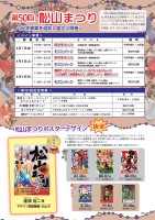 佳作特別賞まつこいパークまつこいパーク 5月19日に行われた松山まつり実行委員会の宣伝分科会において、ポスターデザインの審査が行われ、最優秀賞、佳作、特別賞が決定しました。最優秀賞には、松山市食場町の瀧頭裕二さんのデザインが選ばれました。 最優秀賞に選ばれた作品は、商店街や各種施設等に広く配布し掲示されます。18:00~20:308月7日(金)8月8日(土)8月9日(日)野 球 拳 お ど り野 球 拳 お ど り16:00~22:0017:00~20:3011:00~22:0017:00~19:0011:00~21:00東京ディズニーリゾート®・スペシャルパレードこども部門(野球拳おどり,野球サンバ)・野球サンバ東京ディズニーリゾート®・スペシャルパレードこども部門(野球拳おどり,野球サンバ)・野球サンバ開 催 日 時イ ベ ン ト場 所千舟町通り・大街道堀之内公園千舟町通り・大街道堀之内公園千舟町通り・大街道堀之内公園野 球 拳 お ど り野 球 拳 お ど り( 野球拳おどり演舞、グルメ屋台、企業PRブース、 子供の遊び場等設置、各種イベント)( 野球拳おどり演舞、グルメ屋台、企業PRブース、 子供の遊び場等設置 )( 野球サンバ演舞、表彰式、グルメ屋台、 企業PRブース、子供の遊び場 等設置、各種イベント )まつこいパークまつこいパークまつこいパークまつこいパーク行 事 名内 容東京ディズニーリゾート®スペシャルパレード光(映像)を使ったショーキャラクターショー俳句アートコンテストステージと踊りが連携した演出を実施8月9日に世界的に有名なキャラクターを招聘しパレードを開催子供が楽しめるキャラクターショーを開催俳句と絵が融合した俳句アートコンテストを開催(小学生対象)場 所千舟町通り・大街道堀之内公園堀之内公園おどり会場他( 企業連の部・無審査連の部 )( 団体連の部・無審査連の部 )最優秀賞たきがしらゆうじ瀧頭 裕二 様デザイン関連業種/松山市さがわみつえ佐川 光恵 様デザイン関連業種/松山市もりむねとしひと森棟 俊仁 様デザイン関連業種/松山市みぞたかずお溝田 和生 様デザイン関連業種/伊予郡砥部町あずまやまと東 大飛 様専門学校生/松山市いまえあい今江 愛 様専門学校生/松山市あきやまなお秋山 菜緒 様専門学校生/今治市 今年、50周年の節目を迎える松山まつりは、野球拳おどりや野球サンバ、堀之内まつこいパークなどの事業に加え、スペシャルパレードをはじめとする各種記念事業を開催します。ぜひご来場ください。~記念事業を追加し盛大に開催~第50回 松山まつり松山まつりポスターデザイン< メ イ ン 事 業 >< 第 50 回 記 念 事 業 >< 第 50 回 記 念 事 業 >決定決定特集6