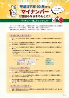 117700334455668899マイナンバー導入チェックリスト< 担当者の明確化と番号の取得 >< 担当者の明確化と番号の取得 >< マイナンバーの管理・保管 >< マイナンバーの管理・保管 >< 従業員の皆さんへの確認事項 >< 従業員の皆さんへの確認事項 >マイナンバーが国民みなさまのもとに!導入準備は進んでいますか?マイナンバーを扱う人を、あらかじめ決めておきまし ょう(給料や社会保険料 を扱っている人など)。 マイナンバーを従業員から取得する際には、利用目的(「源泉徴収票作成」「健康保険・厚生年金保険届出」「雇用保険届出」)を伝えましょう。 マイナンバーを従業員から取得する際には、番号が間違っていないかの確認と身元の確認が必要です。 ①顔写真の付いている「個人番号カード」か、②10月から届くマイナンバーが 書いてある「通知カード」と「運転免許証」などで確認を行い ましょう。 ※ 従業員で身元の確認が十分できている場合は、番号だけ確認してください。 ※ アルバイトやパートの方も、マイナンバーの番号確認や身元確認が必要となります。マイナちゃんマイナンバーが記載された書類は、カギがかかる棚や引き出しに大切に保管するようにしましょう。無理にパソコンを購入する必要はありません。 パソコンがインターネットに接続されている場合は、ウィルス対策ソフトを最新版に更新するなどセキュリティ対策を行いましょう。 従業員の退職や契約の終了などでマイナンバーが必要なくなったら、細かく裁断するなどマイナンバーの書いてある書類を廃棄しましょう。パソコンに入っているマイナンバーも削除しましょう。 マイナンバーの導入に際し、事業者のみなさまは、社会保障や税の手続きのため、従業員の 方々から マイナンバーを取得し、適切に管理・保管する必要があります。 従業員数の少ない事業者では、以下のチェックリストを参考にしてください。左面を掲示板に貼るなどして、従業員のみなさまに通知が届く時期や何に使うかなど、基本的なことを知ってもらいましょう。【個人番号カード】【通知カード】表面(案)裏面(案)から平成27年10月特集4