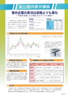 業況売上資金繰り採算松山管内景況調査管内企業の景況は前期よりも悪化~今後の見通しも小幅ながらマイナス傾向~ 当会議所では、地域商工業者の景況並びに経済動向等に関する情報の収集・分析を行っています。今号では、平成27年7~9月期の調査結果がまとまりましたので、ご報告します。【調査時期】四半期毎に調査(年4回実施)【調査期間】平成27年8月22日~ 9月1日【調査対象】当会議所議員、地域振興委員等185企業 前期から一転、全てのDIが悪化に転じました。来期の見通しは、売上のDIは改善するものの、その他のDIは悪化傾向となっています。 今期、設備投資を実施したと回答した事業所は36件、前期(40件)より減少しています。来期に実施を計画している事業所数は28件となり今期より減少となりました。 前期から一転し、管内業況は全ての業種において悪化しています。来期の見通しについては、売上増には期待できるものの、業況は総じて厳しい状況です。設備投資も減少する中で、経営上の問題点には、需要の停滞のほか、技術者や従業員の確保難が回答されており、企業の人手不足が業況に影響しているとも考えられます。調査概要回答状況産業製造建設卸売 小売サービス対象数回答数27222352611851518133846130合計需要の停滞材料価格の上昇需要の停滞ニーズへの対応従業員の確保難1位順位産業2位3位製造業建設業卸売業小売業サービス業製品単価低下技術者の確保難販売単価低下大型店等との競争ニーズへの対応原料価格上昇従業員の確保難大企業との競争需要の停滞需要の停滞全産業におけるDI値の推移設備投資の実施状況今期直面している経営上の問題点今期直面している経営上の問題点!! 全ての業種において、それぞれのDI値の改善及び悪化が混在しています。来期の見通しについては、製造業・小売業・建設業・サービス業の売上DIが改善傾向にあるものの、業況DIが全産業で悪化しています。産業別動向統括まとめ20151050-5-10-15-20-25-30-35-40-45-50271-3251-3254-6257-92510-12261-3264-6267-92610-12274-6277-92710-12(見通し)4特集