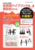 会員間ハイブリッド商談会2016松山商工会議所2016年2月23日自社の商品・製品・サービスを売りたい企業大募集!!場 所:国際ホテル松山 3階 常盤の間(松山市一番町1-13 TEL089-932-5111)対 象:当所会員企業参加費無料伴走型小規模事業者支援推進事業自社ブースでPRできる!1参加者同士でも商談ができる!3地元中堅・大手企業に直接売り込める!2▶自社ブースで商品のPRができるため、新規取引のきっかけをつくりやすい。▶商品を地元中堅・大手企業の経営者や担当者に売り込めるため、新規取引に繋がりやすい。また、商品ブラッシュアップのためのアドバイスを直接聞くことができる。▶異業種交流により、新たなビジネスチャンスに繋がる機会もある。新商品・オリジナル商品等をPRしたい小規模企業・中小企業等(30~50社)小規模企業・中小企業の商品・製品・サービスに興味のある地元中堅・大手企業等募集内容主催/松山商工会議所14時~17時商談会17時~18時30分交流会イチオシイチオシイチオシイチオシ特徴のある商品・製品・サービスなど貴社の看板商品をお持ちください。※食品分野では「安心・安全」なもの、ものづくり分野では効率アップに貢献するものが求められています。中堅・大手企業に売り込むために※当所役員・議員より募集予定ハイブリッド商談会とは…メリット○○○商品・製品○○○株式会社特集2