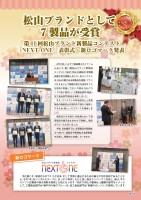 新ロゴマーク 2月15日、いよてつ髙島屋スカイドームにおいて、第11回松山ブランド新製品コンテスト「NEXT ONE」の表彰式・受賞製品展示会を開催しました。当コンテストは、松山の魅力ある新製品を発掘、ブランド化することで販路の拡大を目指すことを目的に実施しており、今回は、松山ブランドの名に相応しい工業製品部門4製品・加工食品部門3製品を表彰しました。 また、コンテストの知名度向上と受賞製品の販路拡大を国内外で強力に後押しするため、新しいロゴマークを発表しました。 表彰式に引き続き、同会場において受賞製品の展示会もあわせて開催し、製品のアピールも行いました。 今後、当会議所では、受賞製品の販路拡大へ向けて、商談会や販路拡大支援事業を活用し、積極的に支援していきます。 手仕事こそ、地域のものづくりが日本、そして世界に進出するための最も大切な技術であることから、その「手」をシンボルモチーフに、まっすぐ伸ばしたひと差し指はナンバーワンを表し、赤は、ネクストワン応募者の熱き情熱を表現した色になります。「NEXT ONE」の書体は、2種類の部門をイメージして、工業製品部門は「瀬戸内の海のブルー」を、加工食品部門は「柑橘のオレンジ」で表現しています。松山ブランドとして7製品が受賞第11回松山ブランド新製品コンテスト「NEXT ONE」表彰式・新ロゴマーク発表表彰状の授与受賞者(加工食品部門)受賞者(工業製品部門)森田会頭の開式の挨拶受賞製品の展示特集2