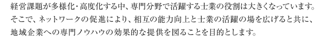 経営課題が多様化・高度化する中、専門分野で活躍する士業の役割は大きくなっています。そこで、ネットワークの促進により、相互の能力向上と士業の活躍の場を広げると共に、地域企業への専門ノウハウの効果的な提供を図ることを目的とします。