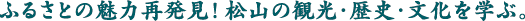 | 自らが地域を愛し、“松山の良さ”を再認識していただくとともに、観光客の皆様を「おもてなしの心」をもってお迎えするためのホスピタリティの向上と、松山の魅力について 自信を持って案内できる人材の育成を目的に、「松山大学 特殊講義」として学生及び一般市民を対象とした公開講座を実施します。是非ご受講ください。 |
